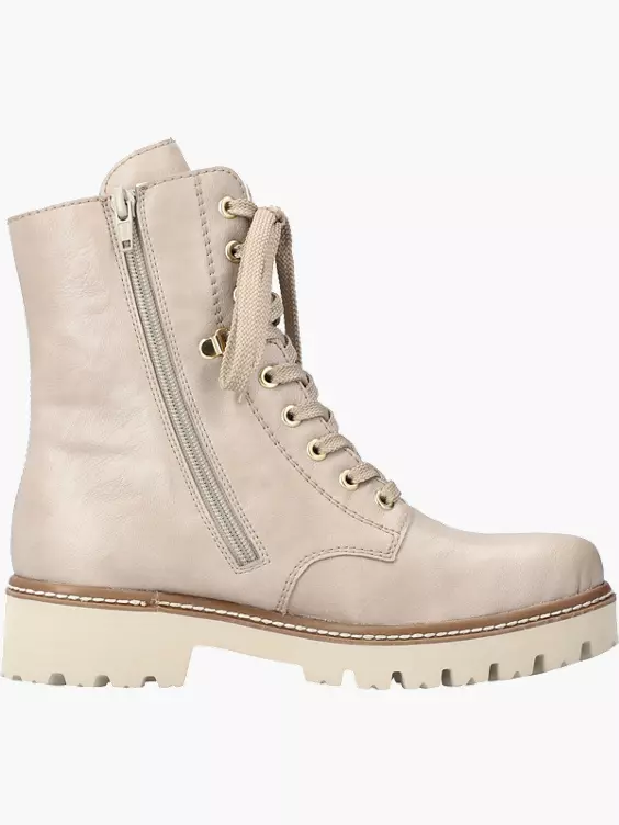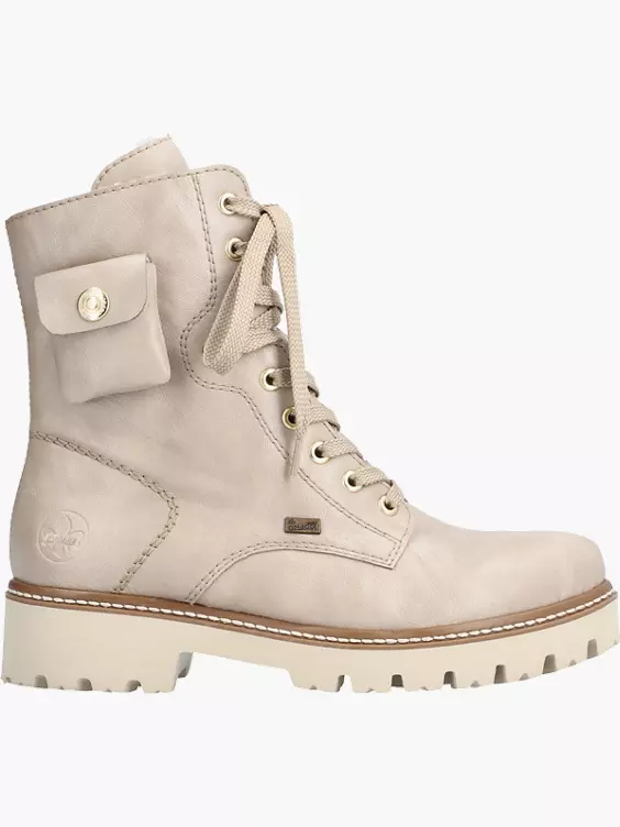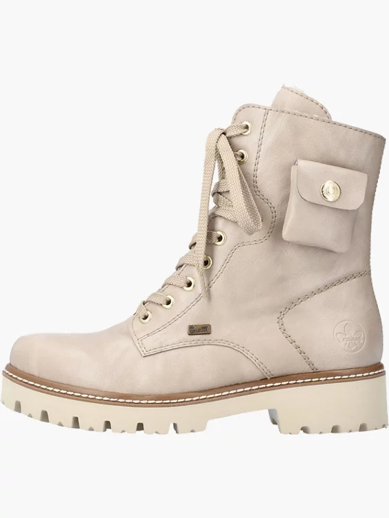 Cozyness, Komfort und Co. treffen auf modernes Design. Rebellisch cool und total angesagt sind diese hellbeigen Biker Boots mit mittelhohem Schaft von Rieker. Die clevere Kombination aus Schnürung und Reißverschluss ermöglicht ein einfaches An- und Ausziehen. Ein stylisches Deko-Täschchen an der Seite ist hübsche Details. Die flexible und ultraleichte Profilsohle verspricht Trittsicherheit und die weiche Decksohle sorgt für extra Tragekomfort. Die Füße bleiben dank dem kuscheligen Lammwollfutter garantiert den ganzen Tag warm und dank RiekerTex-Technologie auch trocken!