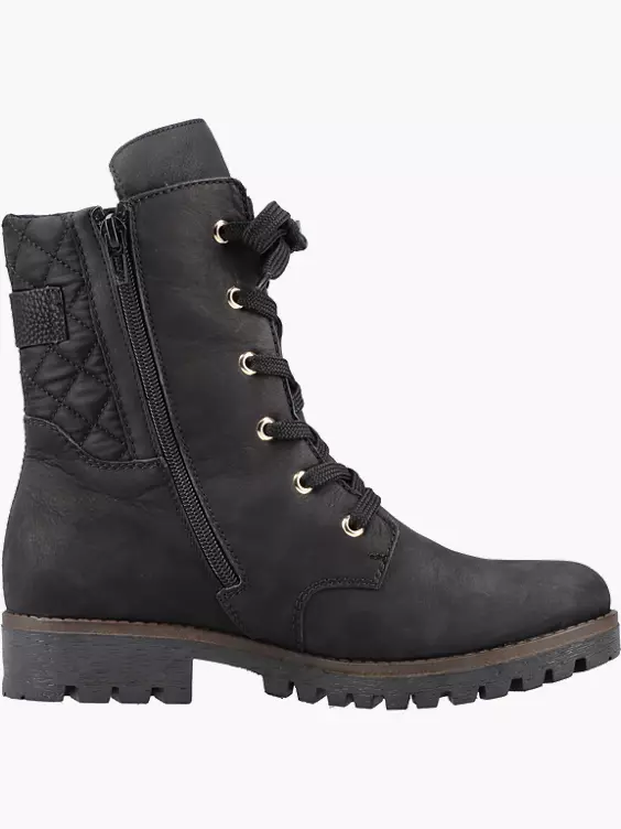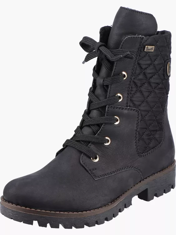 Trend-Boots zum Verlieben! Rebellisch cool und total angesagt sind diese tiefschwarzen Biker Boots mit hohem Schaft von Rieker. Die clevere Kombination aus Reißverschluss und Schnürung ermöglicht ein einfaches An- und Ausziehen. Ein Stepp-Einsatz auf der Rückseite rundet den Look des Schuhs harmonisch ab. Ihre robuste und leichte Profilsohle verhindert ungewolltes Rutschen. Das besonders kuschelige Warmfutter mit Membran hält die Füße garantiert den ganzen Tag lang warm und dank RiekerTex-Technologie auch trocken!